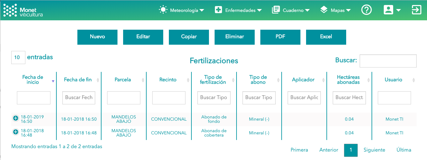 En función del dispositivo con el que te hayas conectado a Monet Viticultura verás un número distinto de columnas en cada tabla para facilitar la visualización. Haciendo clic en cada fila, se desplegará toda la información de la misma.